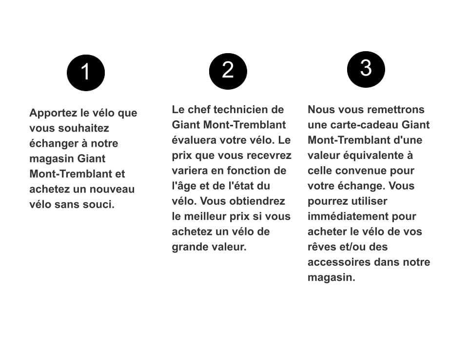Lors de l’achat d’un vélo neuf, vous pouvez nous confier votre vélo actuel et recevoir un crédit en magasin applicable directement sur votre nouveau vélo. C’est une façon simple et avantageuse de passer à un nouveau modèle tout en maximisant la valeur de votre ancien vélo.